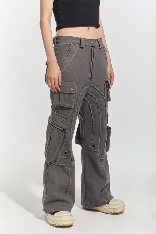 006 WASHED GREY MULTI-POCKET FLARED CARGO PANTS