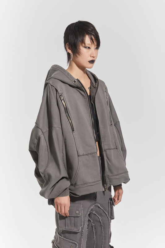 002 'WAVY' WASHED GREY OVERSIZED ZIP UP HOODIE